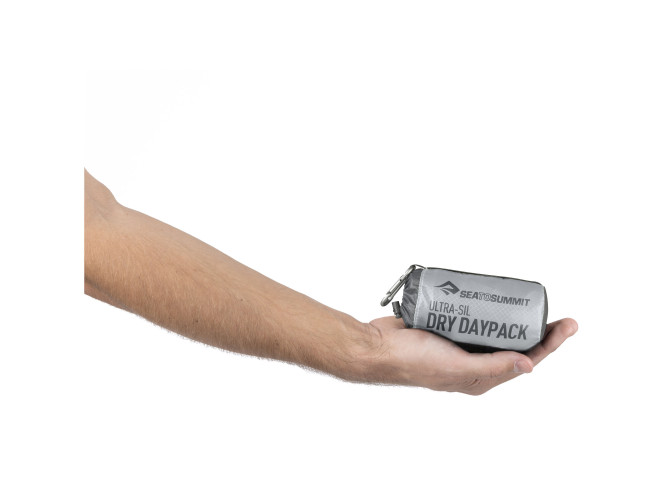 Plecak z serii Ultra-Sil® Dry Day Pack wykonano z silikonowanego materiału CORDURA®. Jest wodoszczelny, bardzo lekki i przechowywany w małym woreczku wyposażonym w hypalonowe kółko do mocowania przy kluczach. O jakości produktu świadczą również podwójne szwy wzmocnione wysokiej gęstości taśmą PU. Unikalne, podwójnie rolowane hypalonowe zamknięcie dobrze uszczelnia wnętrze, a zewnętrzny system sznurowania i kompresji zapewnia bezpieczny transport.