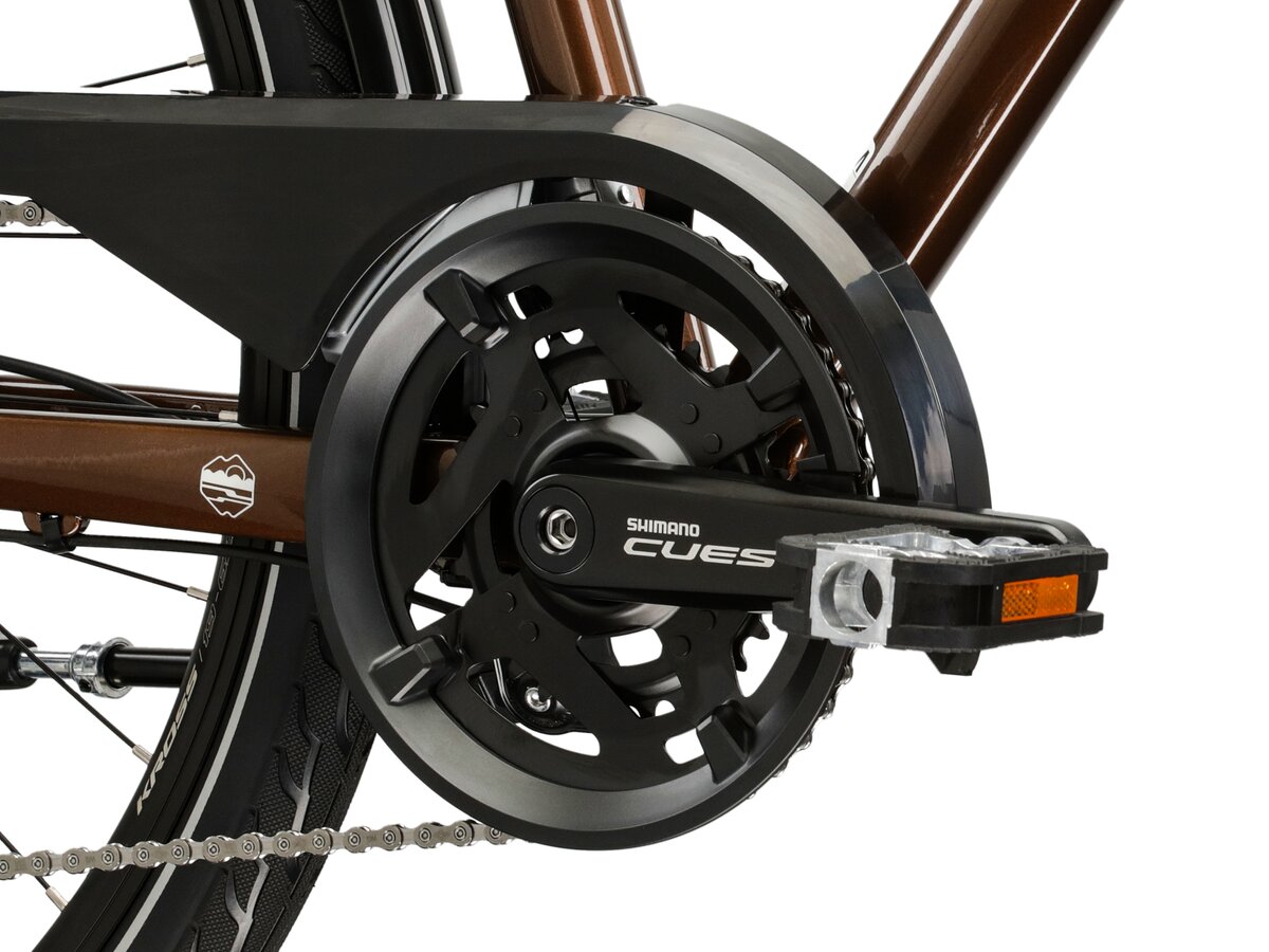 Zintegrowane z rowerem oświetlenie ułatwi jazdę po zmroku, a wysokiej jakości siodełko Selle Royal zachwyci Cię komfortem, jaki zaoferuje Ci podczas pokonywania długich tras. Dodatkowo, siodło zostało osadzone na amortyzowanej sztycy, co niweluje drgania powstające podczas jazdy po nierównościach.